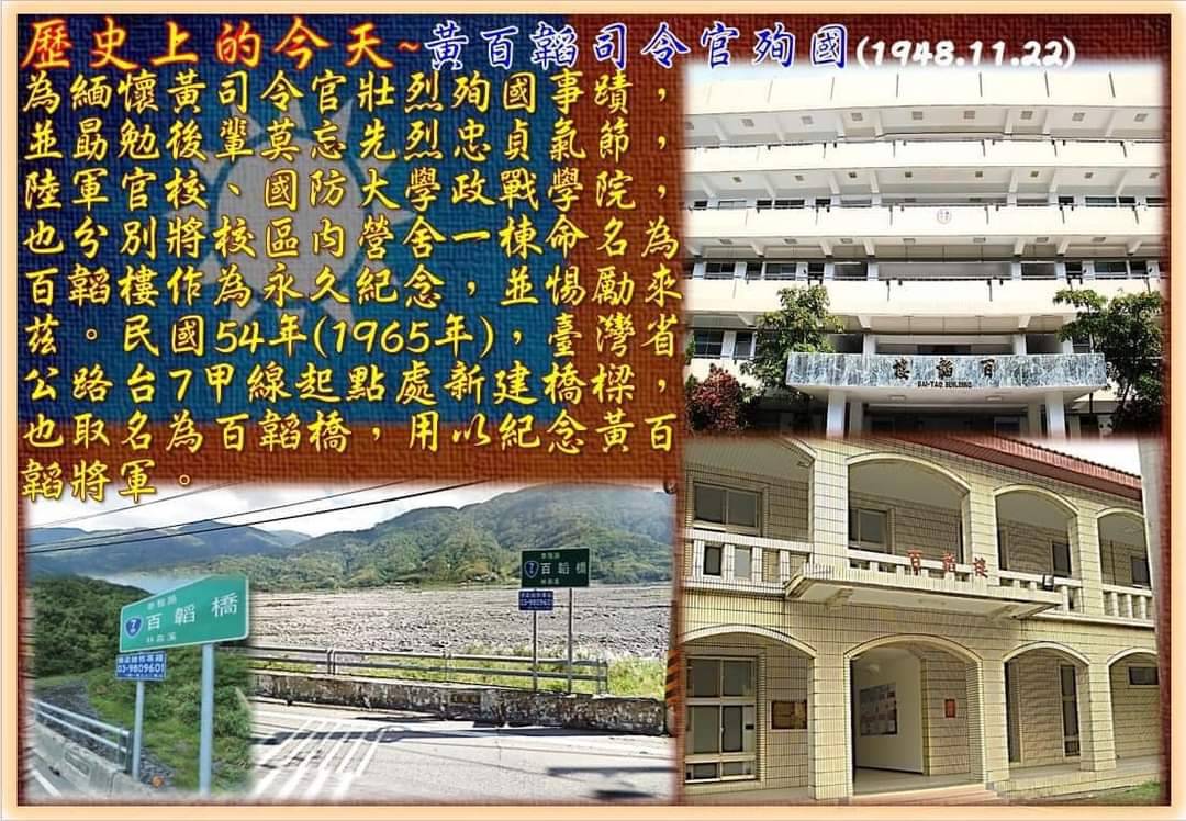 為緬懷黃司令官壯烈殉國事蹟,並勗勉後輩莫忘先烈忠貞氣節,本校將校區內營舍一棟命名為「百韜樓」,用以紀念黃百韜將軍。