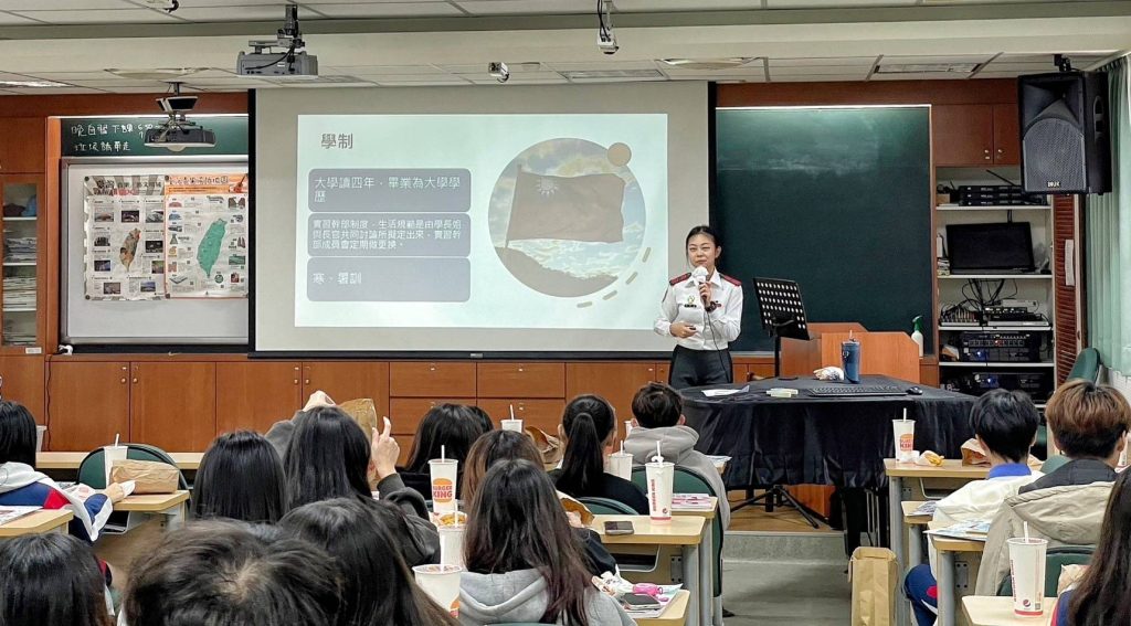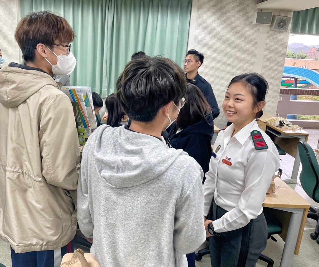 陸軍官校男、女同學與青年學子們座談,針對學校各系特色、未來展望等,向青年學子們分享軍校實際生活經驗,以及透過熱忱交流互動、Q&A等,讓他們更進一步認識和瞭解軍校生生活和學習的全貌。