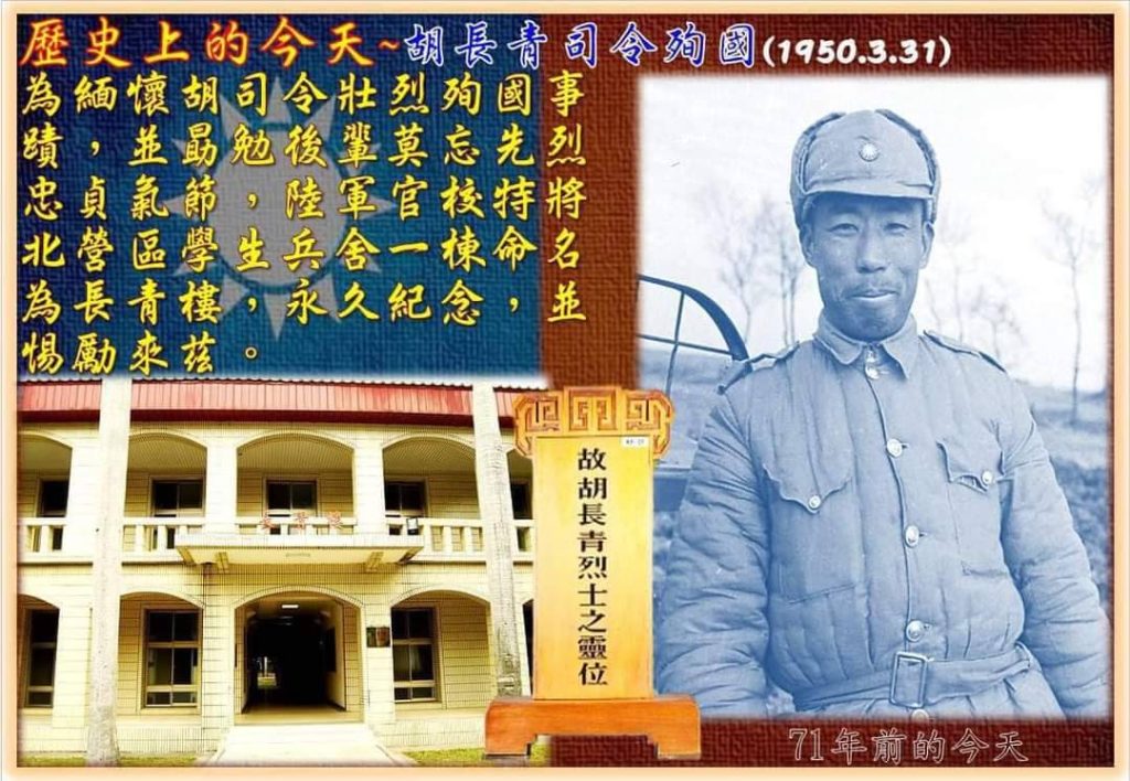 今( 3月31日)為胡長青先烈殉國之日,陸軍官校學六連連長許少校於本月28日率全連學生至先烈塔獻花,以悼念及表彰先烈為國犧牲之忠烈精神與愛國情操,提醒同學們勿忘「 犧牲、團結、 負責」之黃埔精神,並以「 國家、責任、榮譽」為核心價值,成為一名保家衛國的軍人。