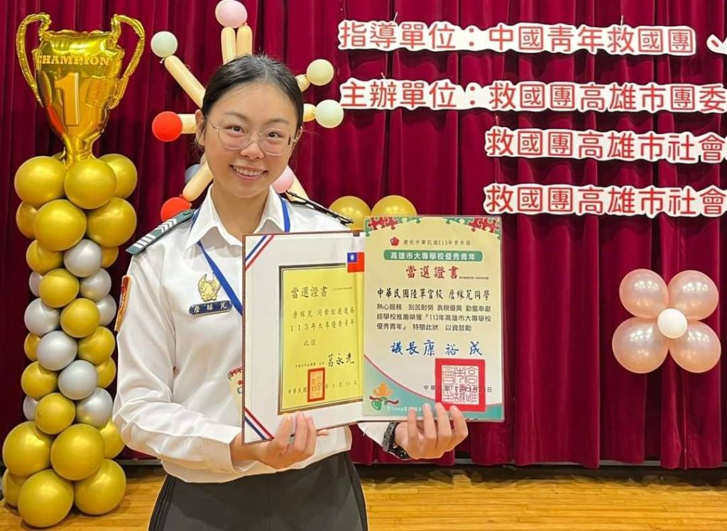 陸官詹綵芃同學當選113年高雄市優秀青年
