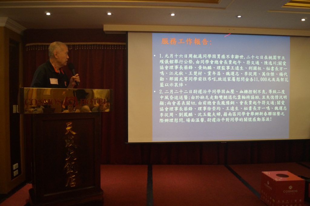 接著,由孫錦生將軍專題報告:慶祝「黃埔建軍、建校百週年」的感觸,內容主要闡述黃埔建軍建校百年的血淚史,沒有黃埔人的犧牲奮鬥就沒有現在的中華民國,看到今日部分人士、媒體對軍人的詆毀、誣蔑、不尊重等真是令人痛心,更擔心母校與軍隊的精神教育,也擔心兩岸未來的發展,我們年歲已高,最多也僅能盡一己之力,下一代只有靠他們自己了;接著由總幹事方一鳴做服務工作報告,說明同學會年來對病傷手術同學及急難救助慰助實況,令在座同學、眷屬頗感溫馨。