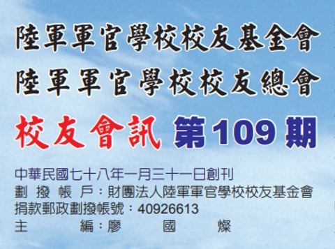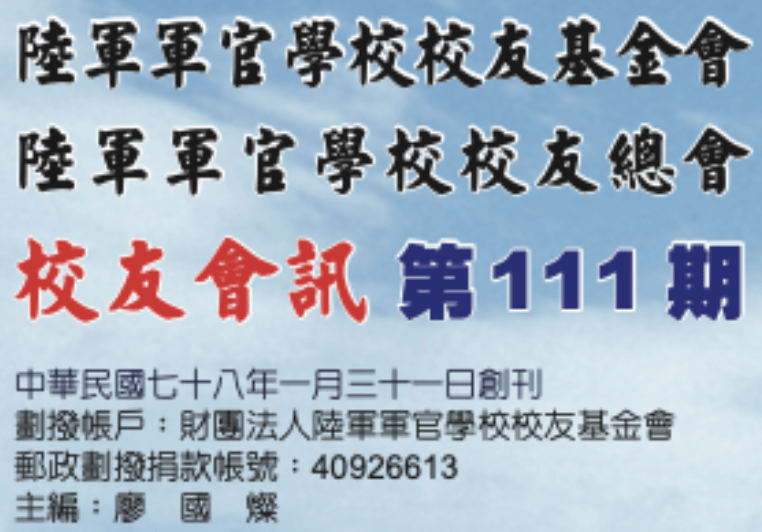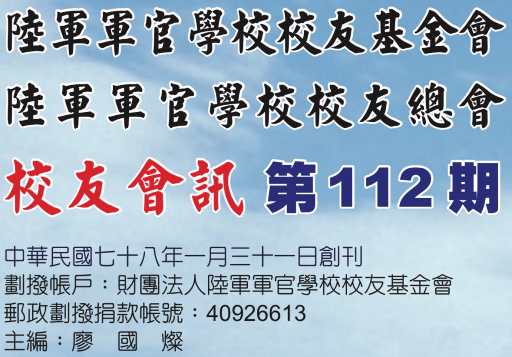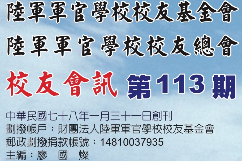 黃埔期刊 黃埔建軍創校一百周年紀念特刊 會訊中心 2024-07-08 會訊第113期 會訊中心 2024-07-08 會訊第112期 Liang 2B 2024-04-01 會訊第111期 Liang 2B 2023-12-30 會訊第110期 Liang 2B 2023-11-06 會訊109期 會訊中心 2023-11-06 1 2 下一頁 » 最新文章 陸軍官校44期同學拜訪官校校長致贈畢業50周年紀念冊2025-10-27 陸軍官校校長拜會基金會2025-10-27 陸軍軍官學校與嘉義大學簽署策略聯盟2025-09-19 陸軍軍官學校新興科技教育「無人機證照班」考取證照達100%2025-09-19 陸官校長北訪感謝校友基金會,共譜育才新篇章2025-09-19